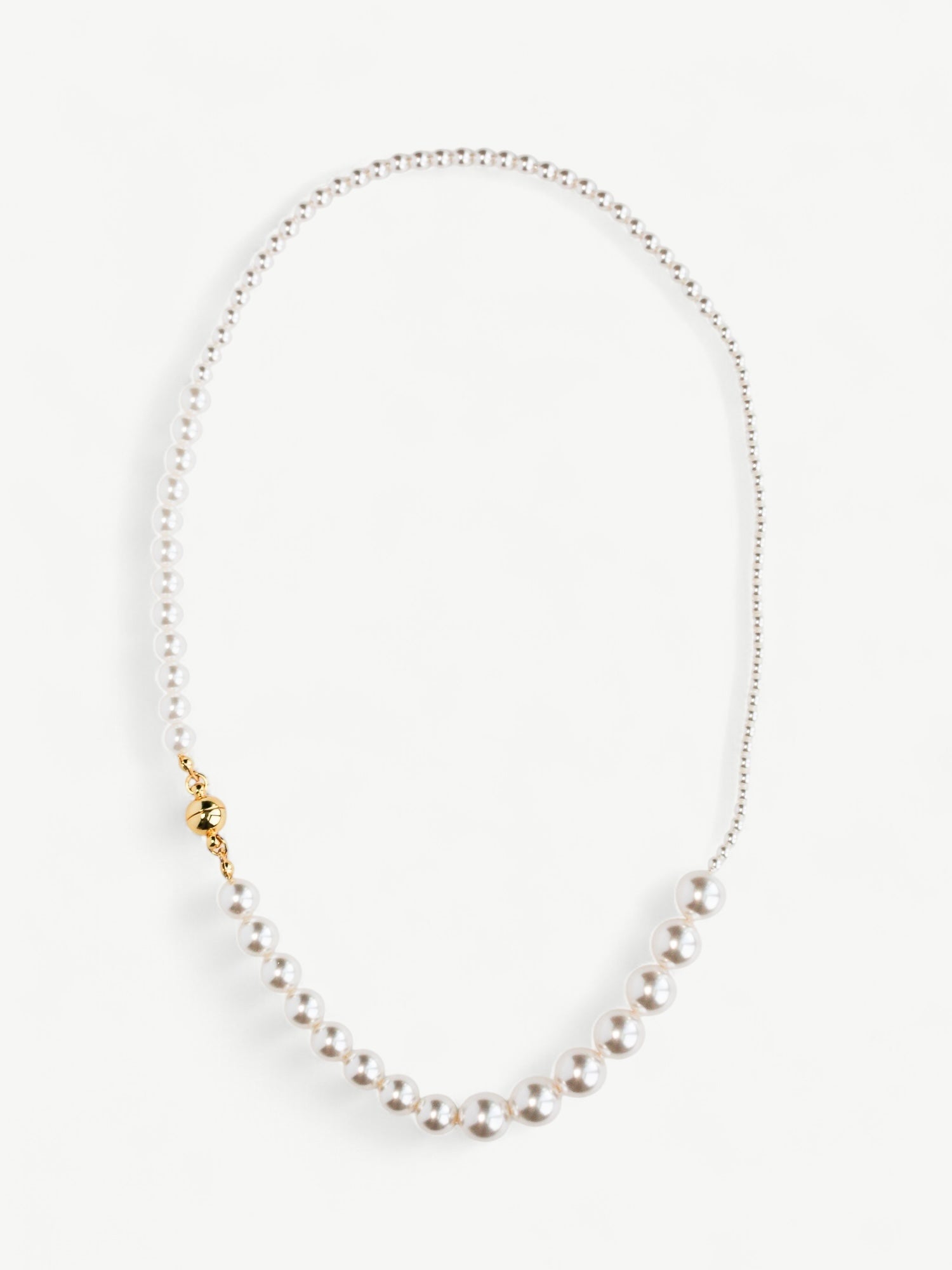 This Abby Pearl Necklace features gorgeous, diversely-sized Swarovski pearls, artistically designed for a timeless yet modern aesthetic. Its magnetic buckle makes it convenient to wear and fashionable enough to match any outfit. The perfect elegant and stylish accessory!