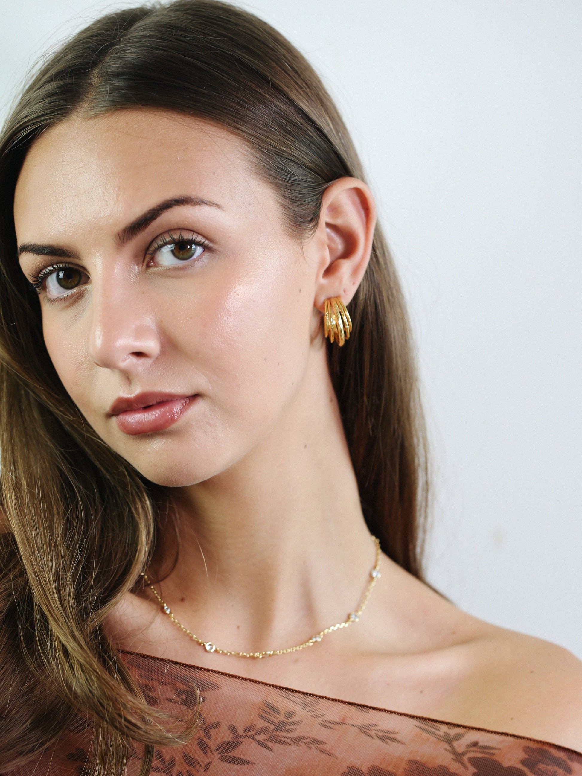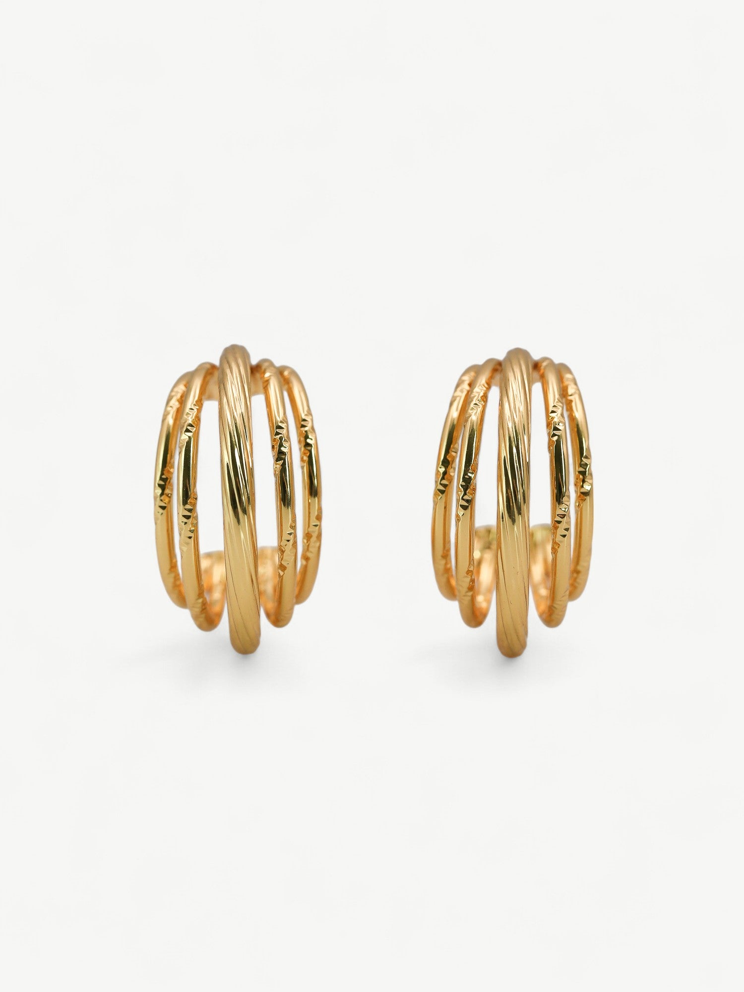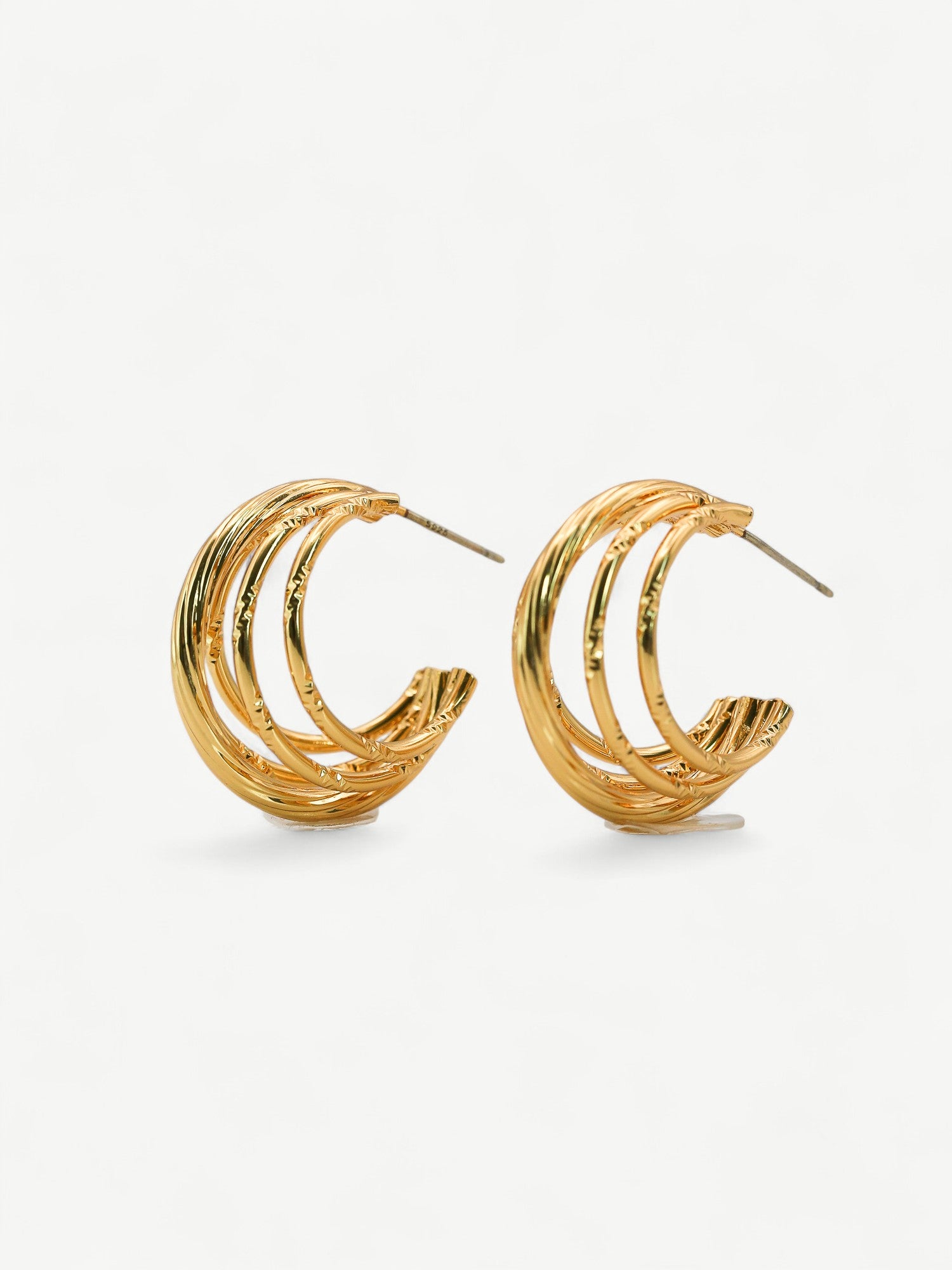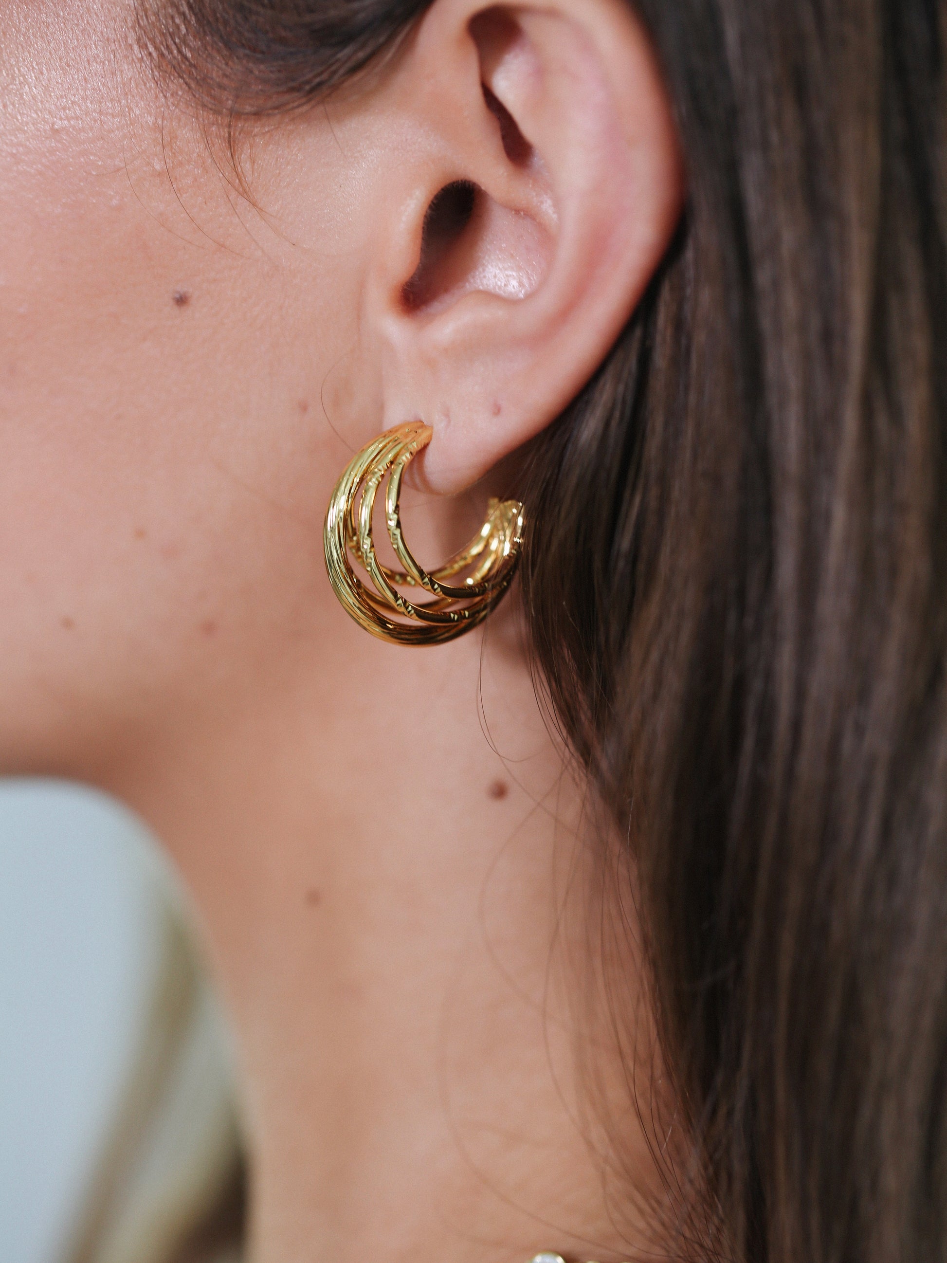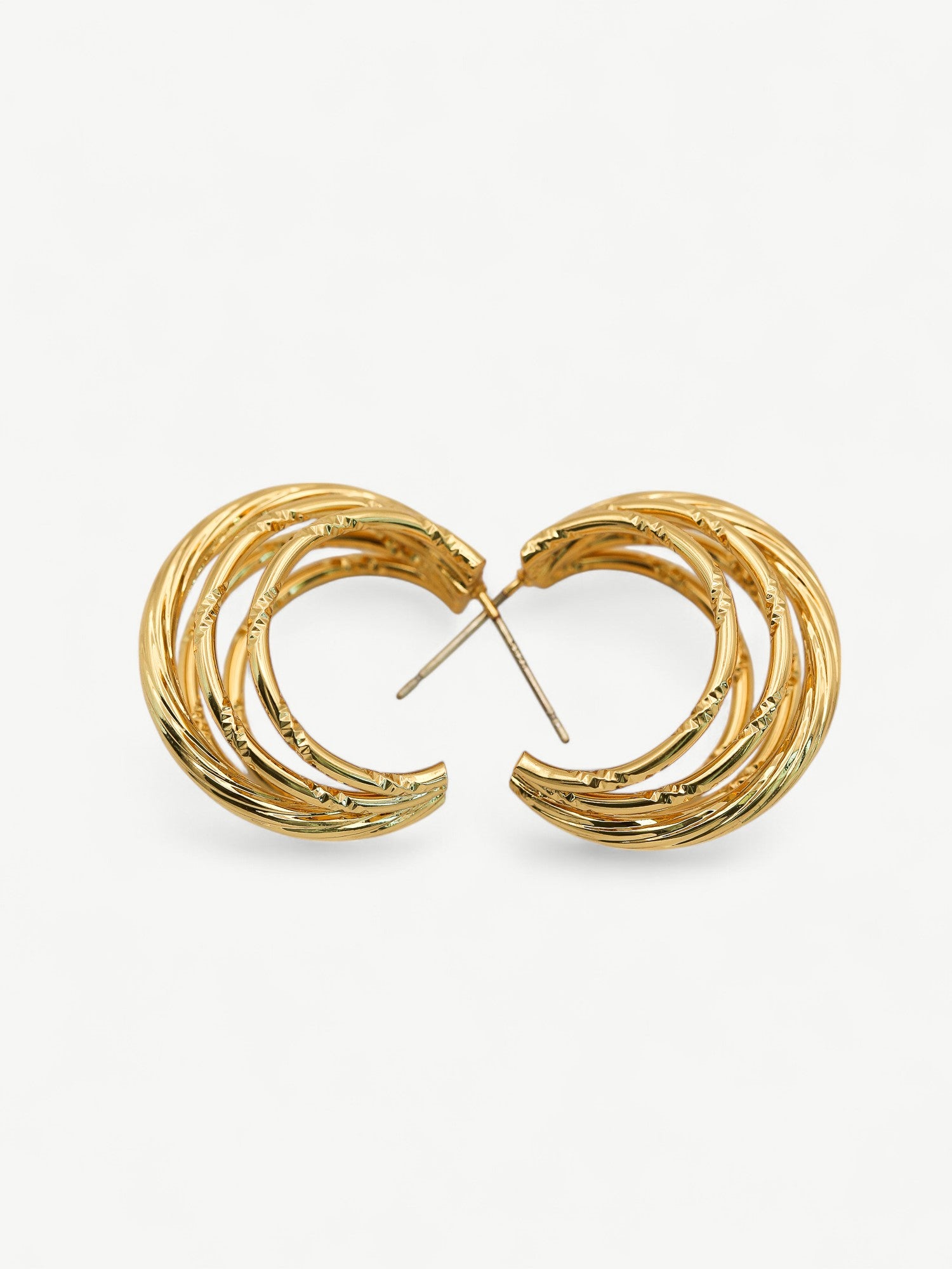 Aurelia Hoops showcase a sculptural layered design that adds depth and sophistication to your look. Expertly crafted with attention to small details, these earrings offer a refined statement piece that elevates any outfit with subtle artistry and elegance.