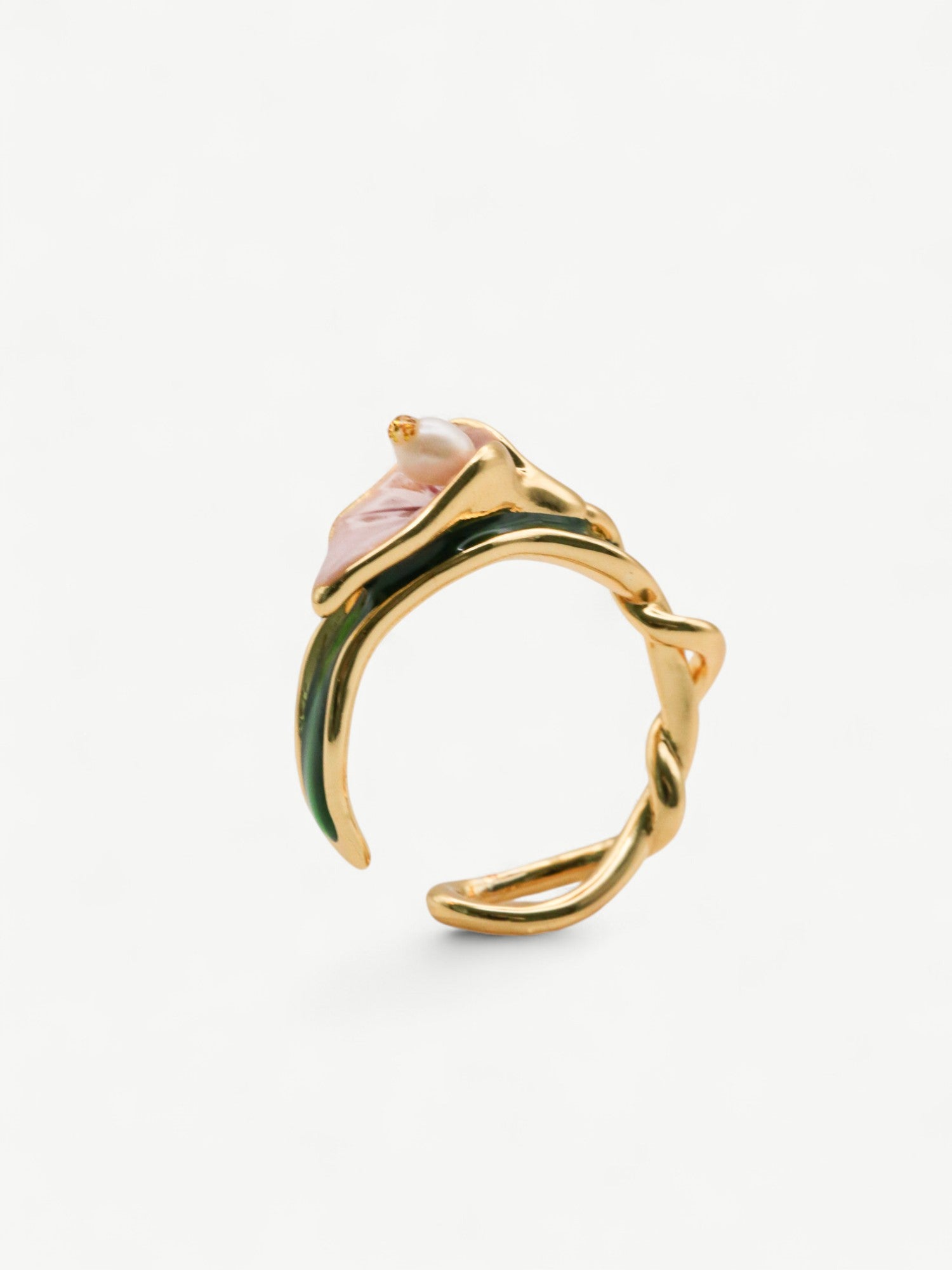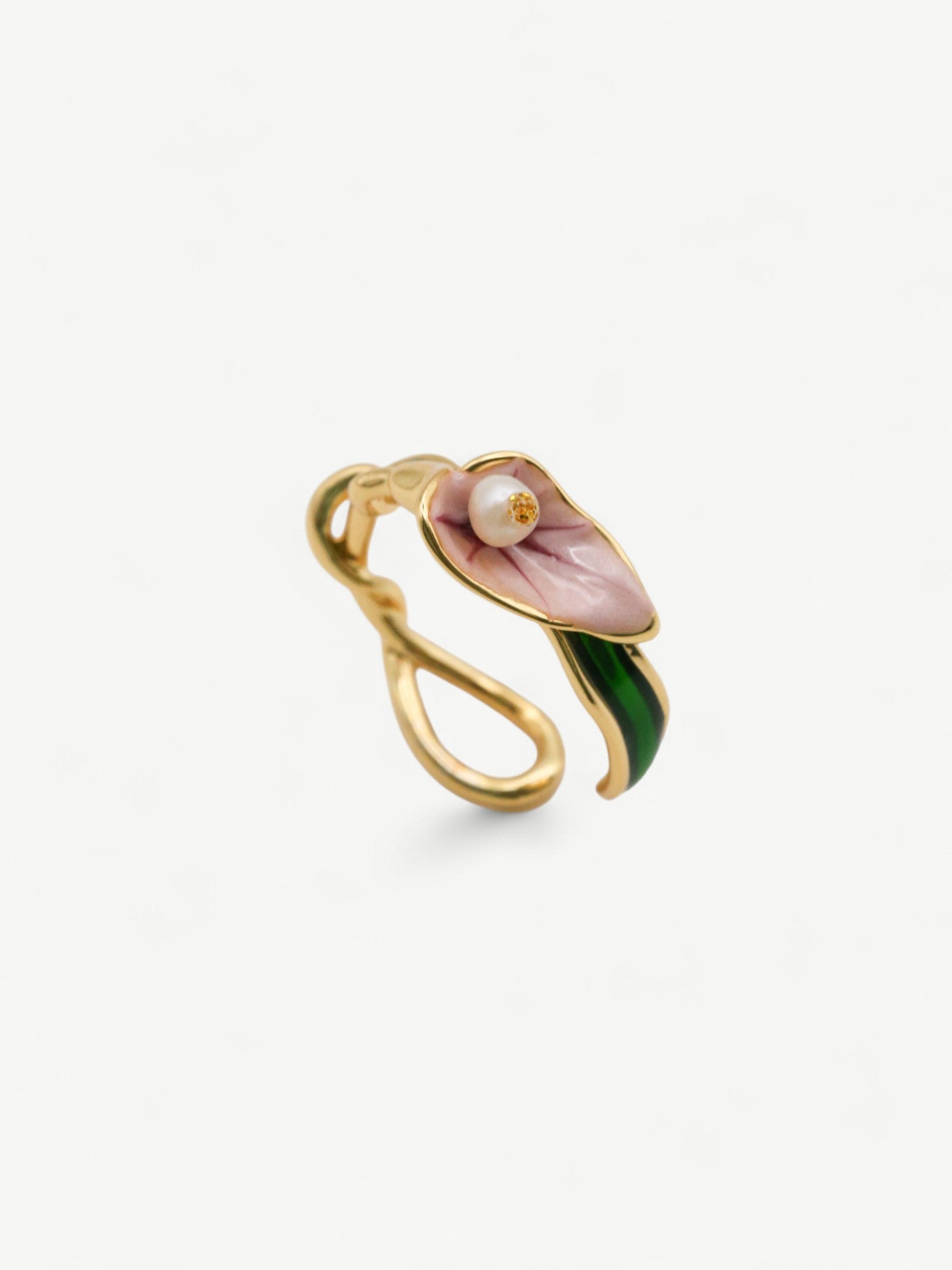 This elegant Calla Lily Ring features a delicate design inspired by the graceful curves of the calla lily flower. Accented with a small freshwater pearl, it offers a refined touch of natural beauty. Expertly crafted, this ring combines subtle sophistication with timeless charm, making it a perfect accessory for both everyday wear and special occasions.
