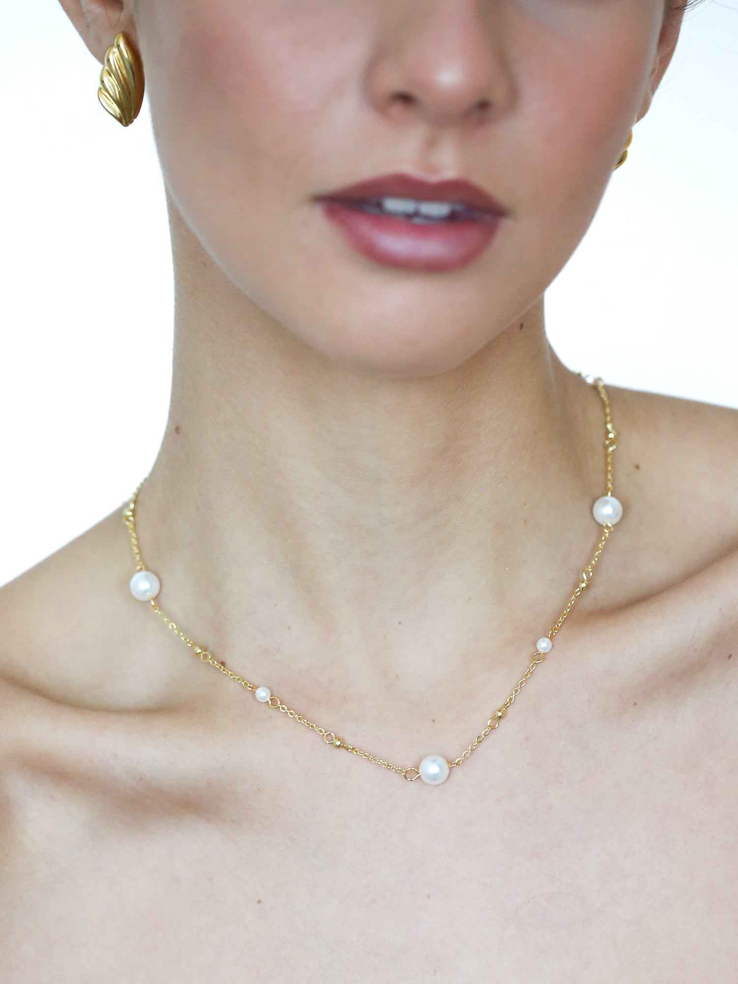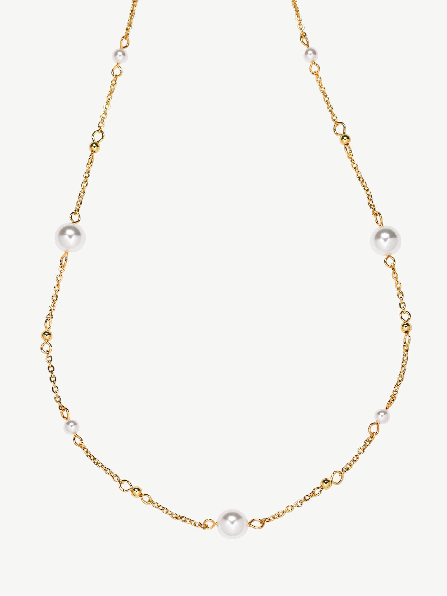 Crafted with 18ct gold plating and adorned with luminous Swarovski pearls, the Mira Tin Cup Pearl Necklace offers a refined balance of elegance and modern style. Its delicate gold ball detail adds subtle sophistication, making it a versatile piece for both solo wear and layering. Ideal for elevating everyday looks or complementing formal attire, this necklace combines quality craftsmanship with timeless design.