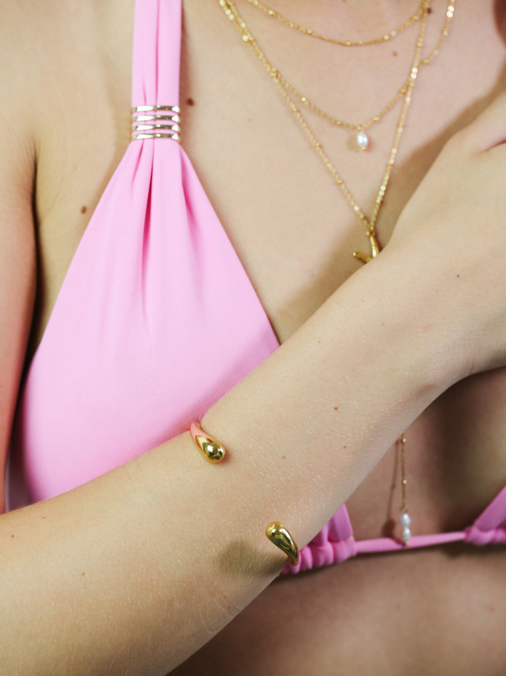 Crafted from premium stainless steel with an 18ct gold plating, the Fluid Curve Cuff Bangle Bracelet boasts a sleek, minimalist design. Its smooth curve and organic, slightly asymmetrical shape give it a unique and modern look. And with its waterproof construction, this bracelet is both stylish and durable, making it the perfect addition to any outfit.