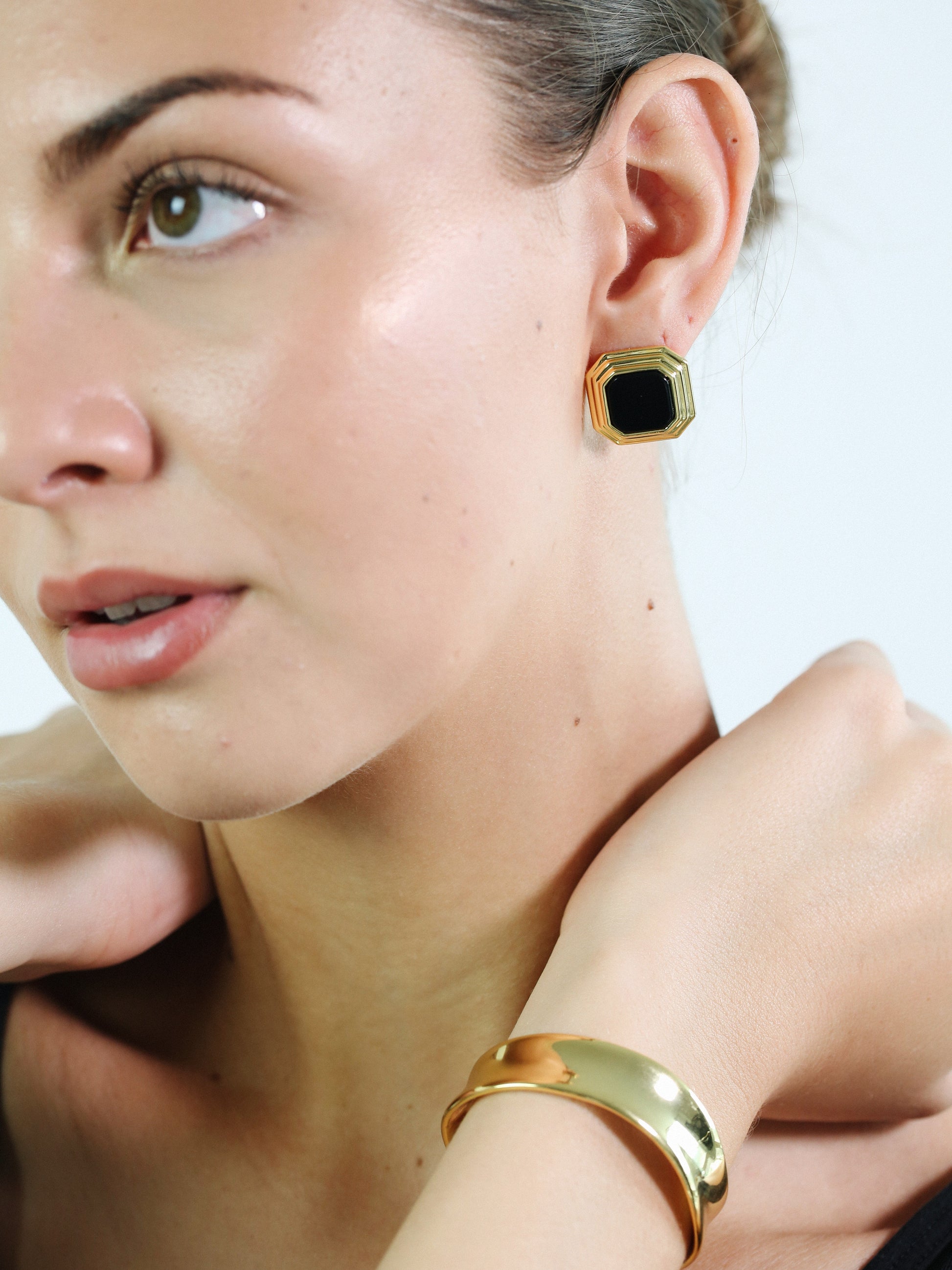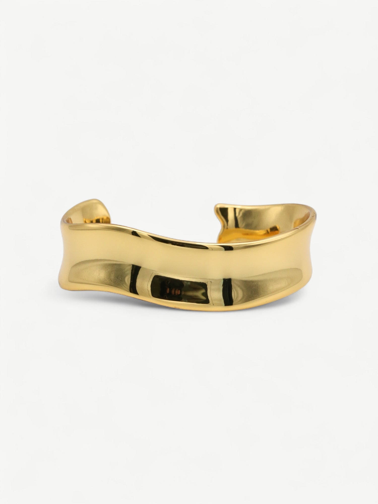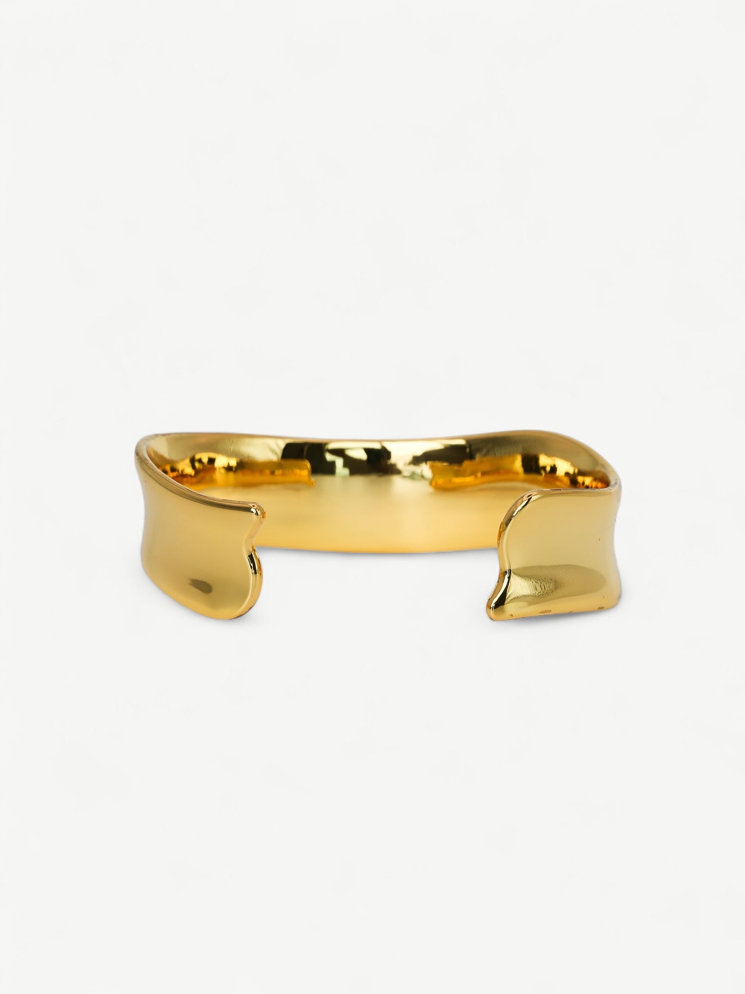 This Gold Curve Cuff Bangle features elegant 18ct gold plating and an adjustable length for a perfect fit. Its refined closing detail ensures secure wear while maintaining a sleek, minimalist design. Classic yet trendy, this versatile piece complements any outfit effortlessly, making it an essential addition to your jewellery collection.
