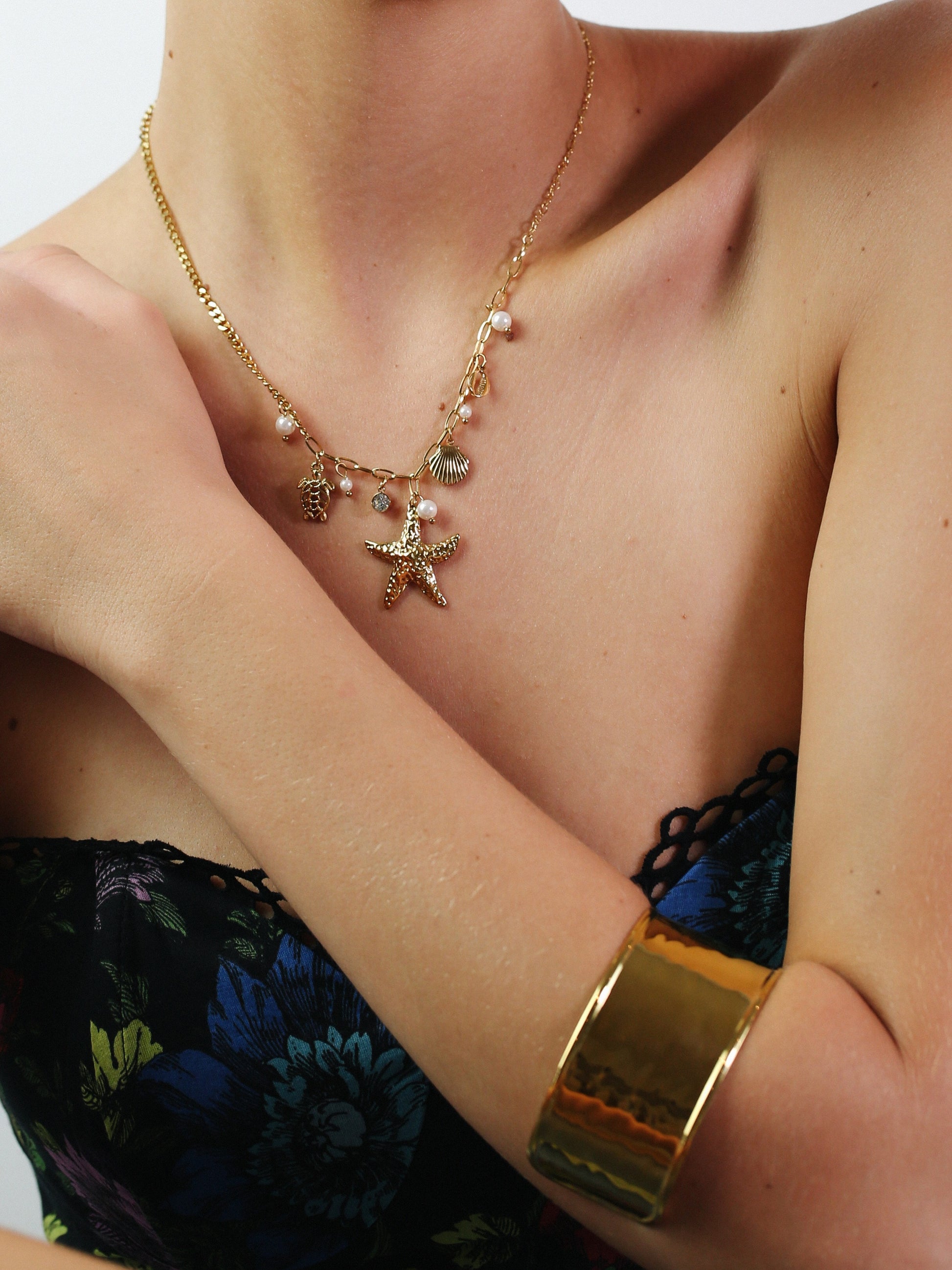 Crafted with expert precision and elegant design, the Golden Muse Bangle Bracelet is the perfect accessory for any occasion. The bold, hammered details give it a sculptural appeal, while the light weight and sleek 18ct gold plating make it a comfortable and glamorous addition to any outfit. Elevate your style with this timeless and sophisticated piece.