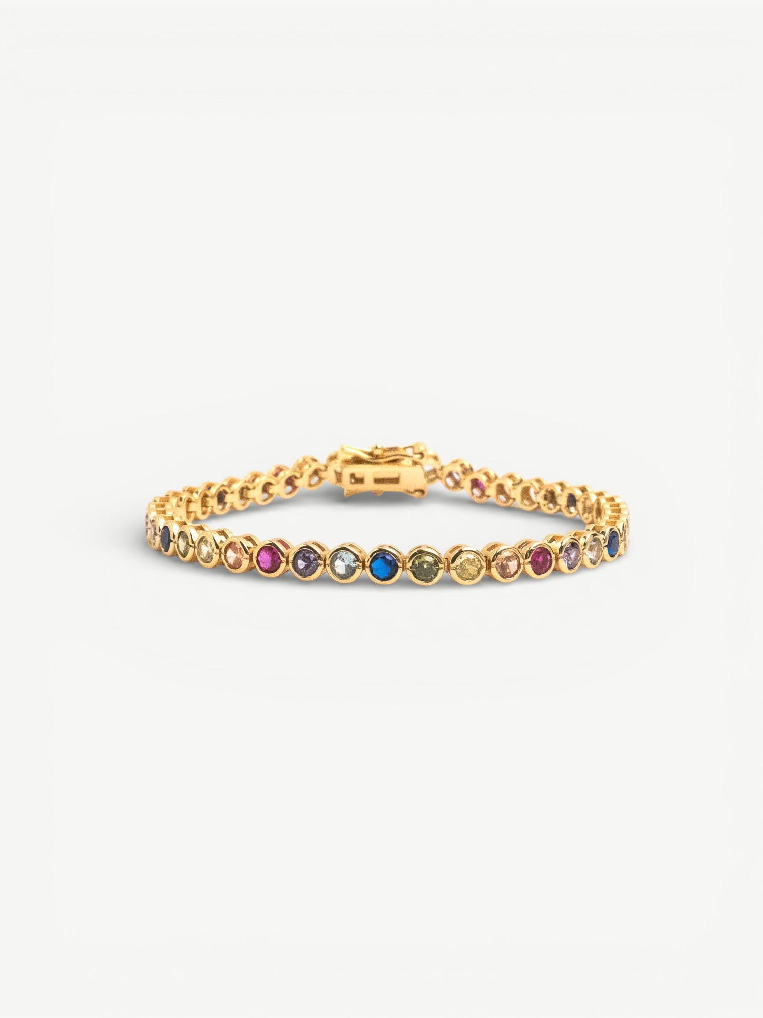 Elevate your jewellery collection with this contemporary take on the timeless tennis bracelet. Featuring vibrant multi-coloured stones that catch the light beautifully, this piece effortlessly transitions from everyday elegance to statement-making glamour. Wear it solo for a bold pop of colour or layer it with other bracelets to create your own unique style. The refined design ensures it complements any outfit, making it the versatile essential every jewellery lover deserves.