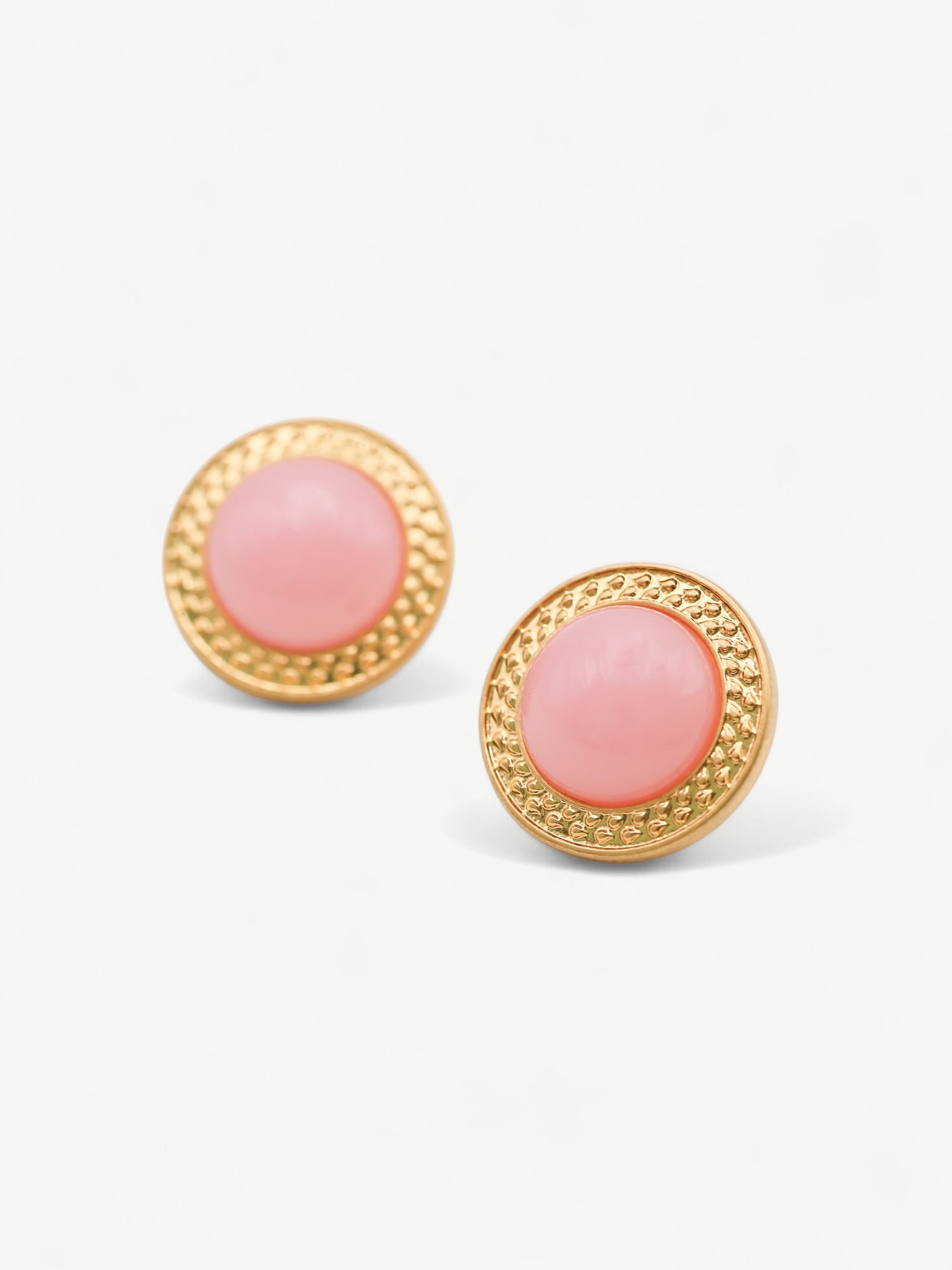 The Rosette Studs capture the essence of vintage glamour with a modern twist. The soft pink glazed glass and textured gold add a touch of elegance, reminiscent of an English summer rose. Complete your summer outfit with these delicate studs for a subtle yet stunning look.
