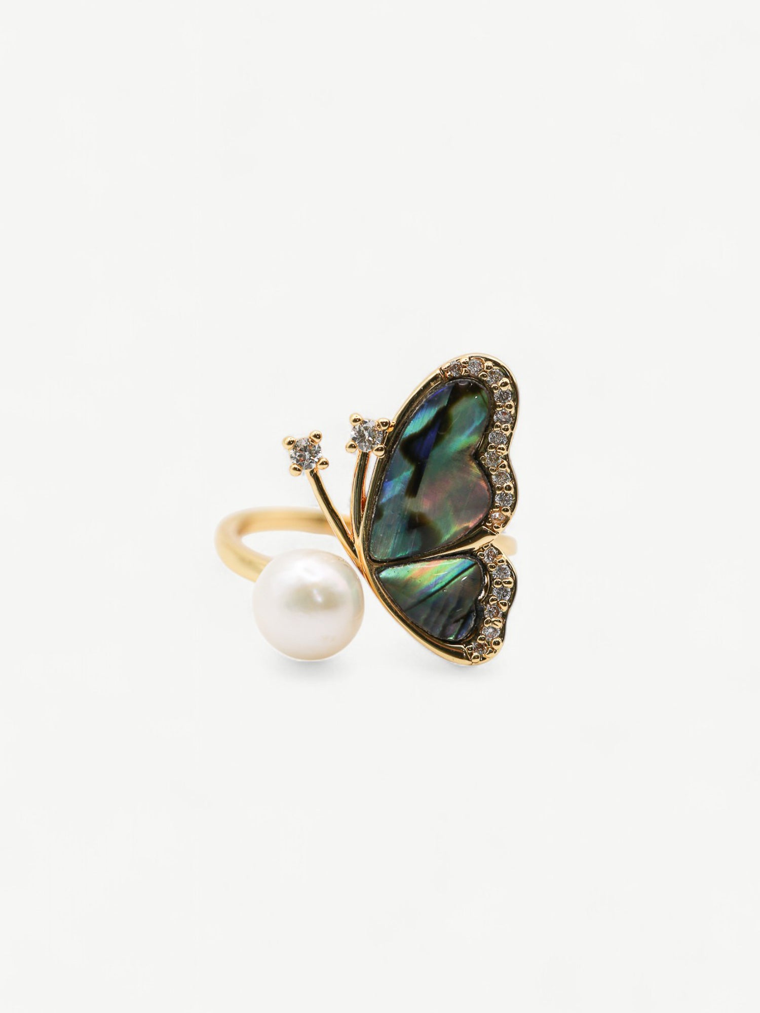 The Butterfly Ring features delicate freshwater pearls and vibrant colored shell accents, expertly crafted on an 18ct gold-plated brass band. This refined piece combines natural beauty with elegant design, offering a timeless accessory that enhances any ensemble with subtle sophistication.